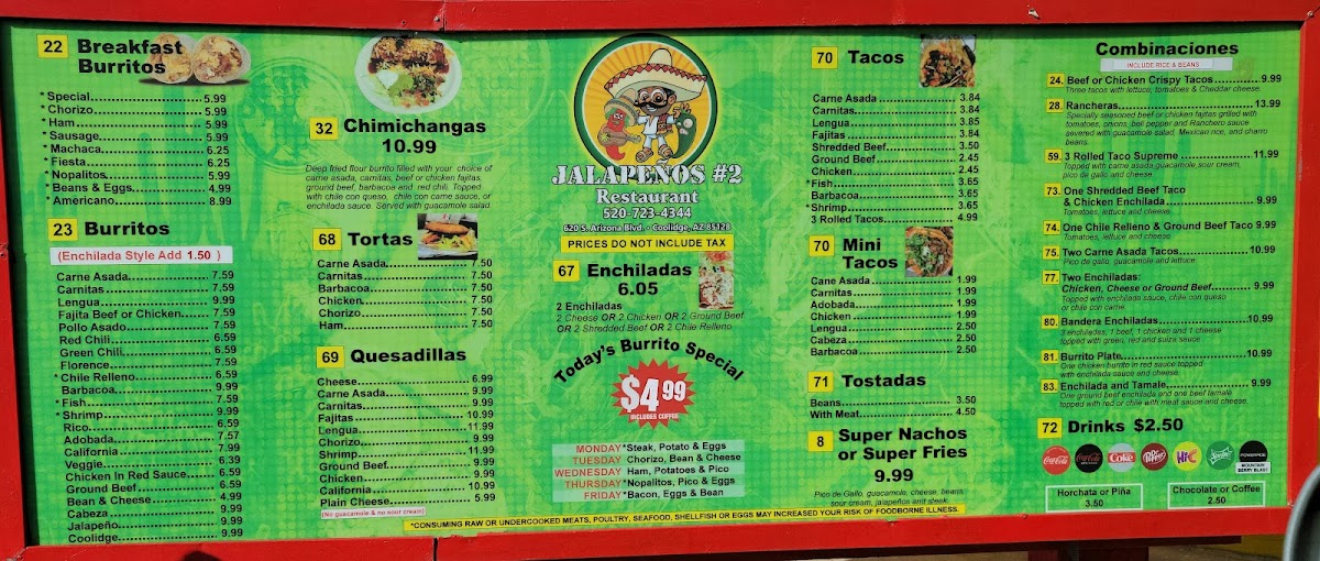 Jalapeños #2 Restaurant in Coolidge, AZ, serves up authentic Mexican flavors with a friendly, local touch. Their menu shines with expertly grilled fajitas—shrimp, beef, and chicken sizzle with fresh onions, bell peppers, and tomatoes, served alongside rice, beans, and guacamole salad. The Rancheras Special features seasoned beef or chicken fajitas enriched with ranchero sauce and melted cheese, a hearty delight for any Mexican cuisine lover.